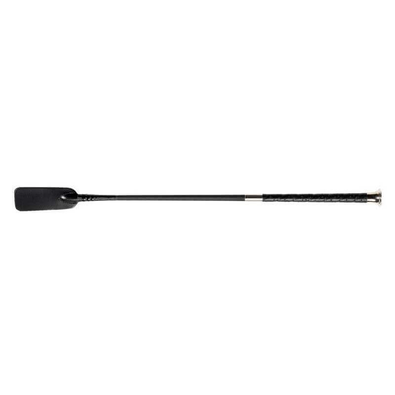 Frustino per monta inglese con bottone in metallo color argento, impugnatura in pelle, rivestimento in nylon intrecciato, puntale doppio aperto.