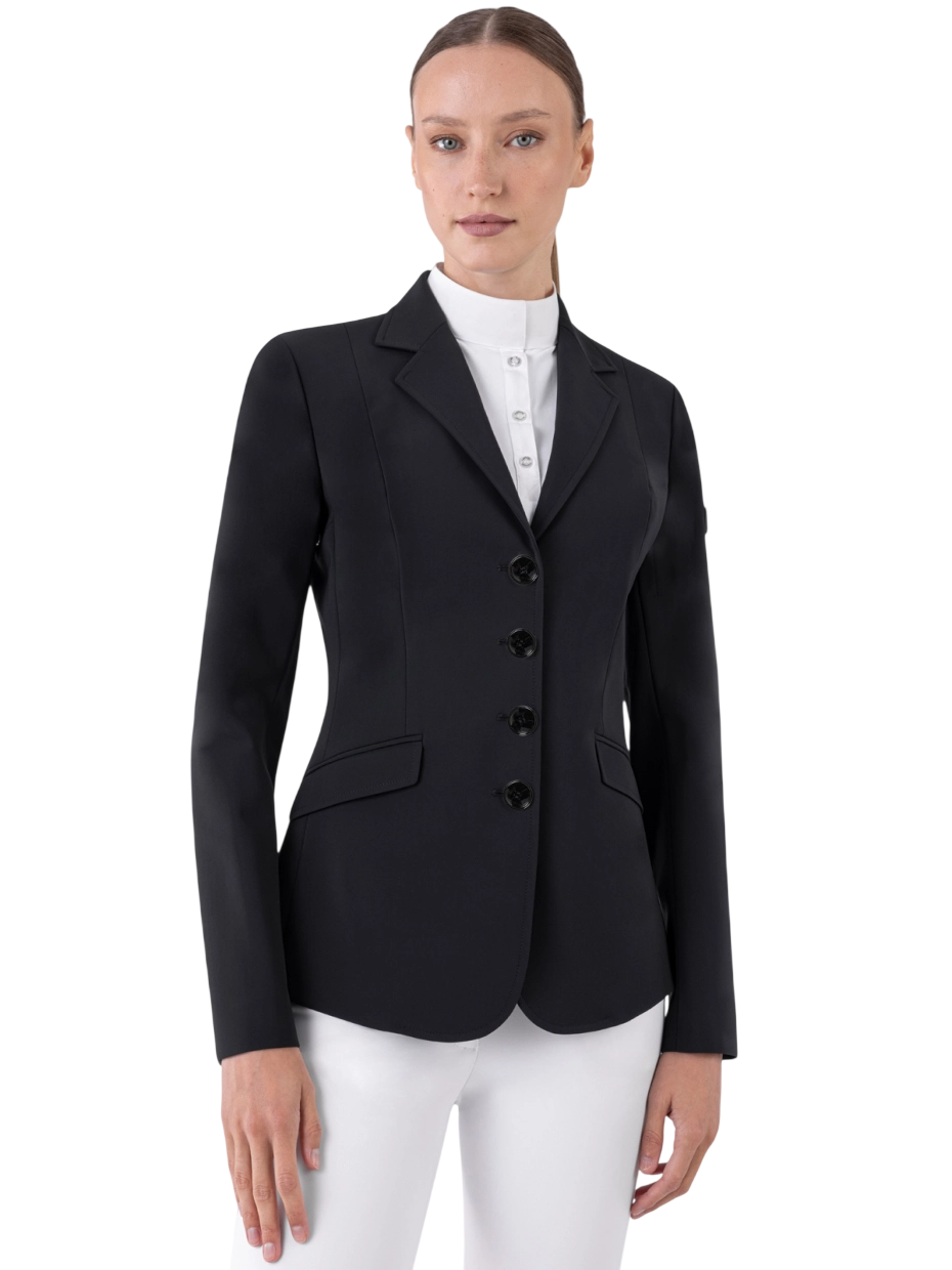 Giacca da competizione Equiline destrutturata realizzata con tessuto B-MOVE, che garantisce comfort e massima libertà di movimento, mentre le due tasche con patta e la chiusura con bottoni ad asola aggiunge un tocco di raffinatezza.