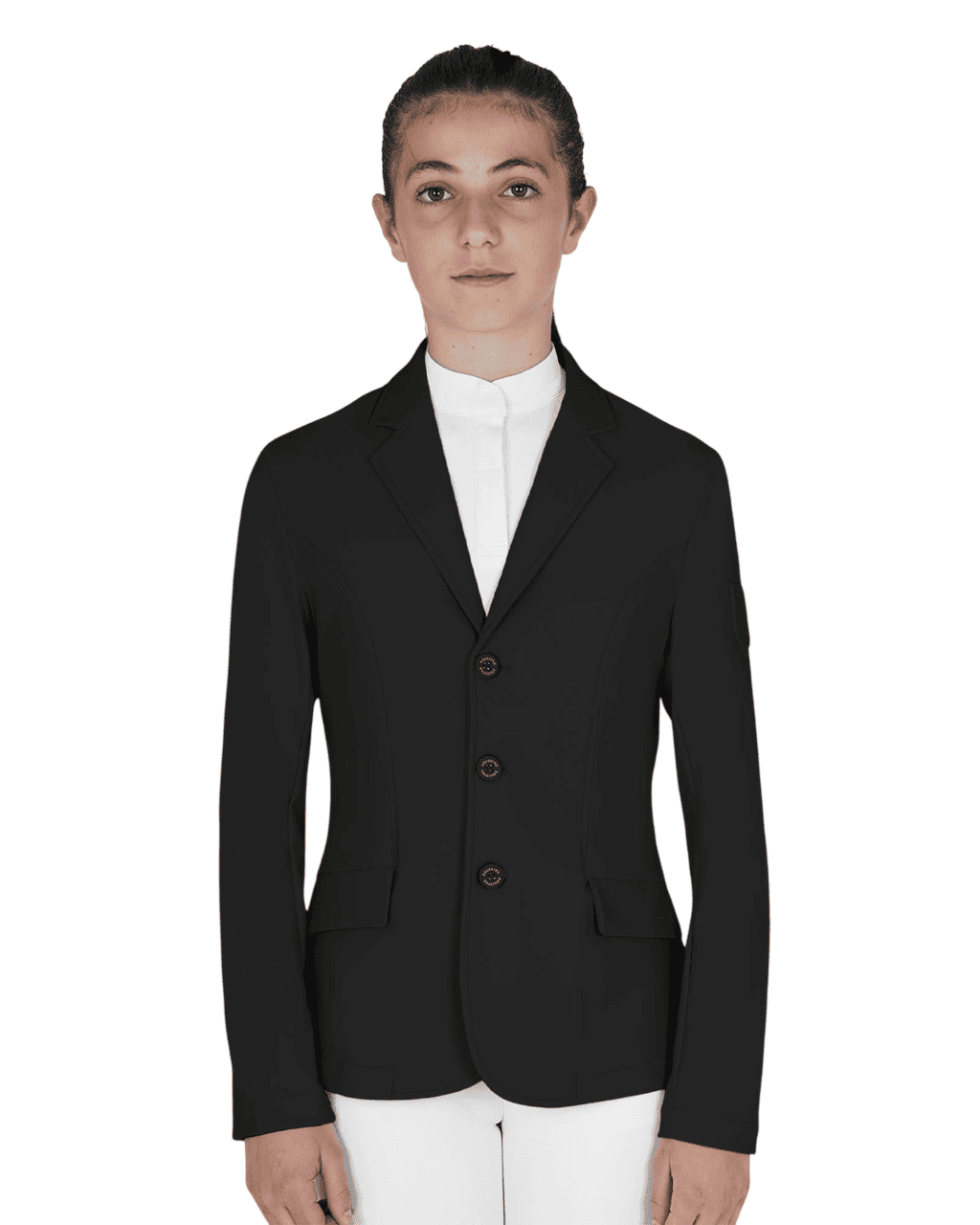 Giacca da competizione junior slim fit modello Girasol realizzata in tessuto tecnico traspirante, morbido ed elastico, per una maggiore libertà di movimento, pur mantenendo l'eleganza tipica dei prodotti Equestro.