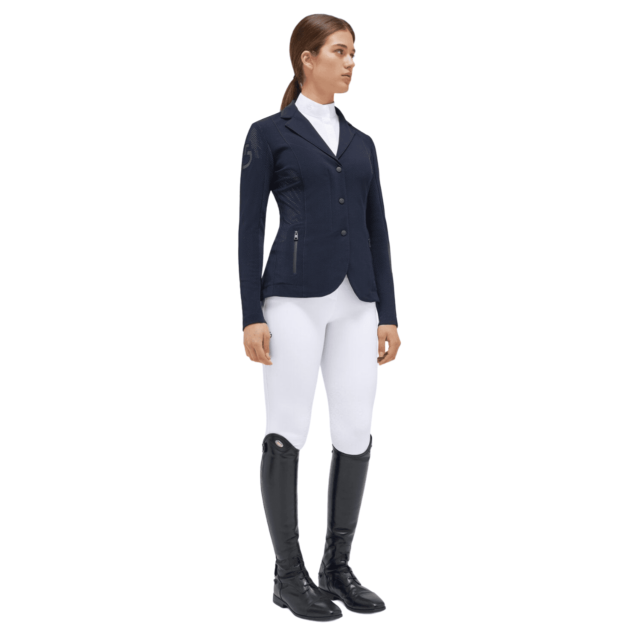 La giacca da equitazione per donna dal taglio classico sartoriale è realizzata in tessuto tecnico bi-stretch elegante e performante.