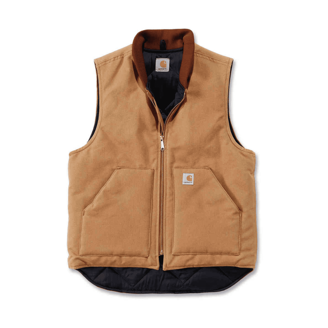 Gilet smanicato Carhartt in canvas con colletto in maglia a costine, due tasche frontali inferiori con fodera trapuntata e tasca interna con chiusura a cerniera.
