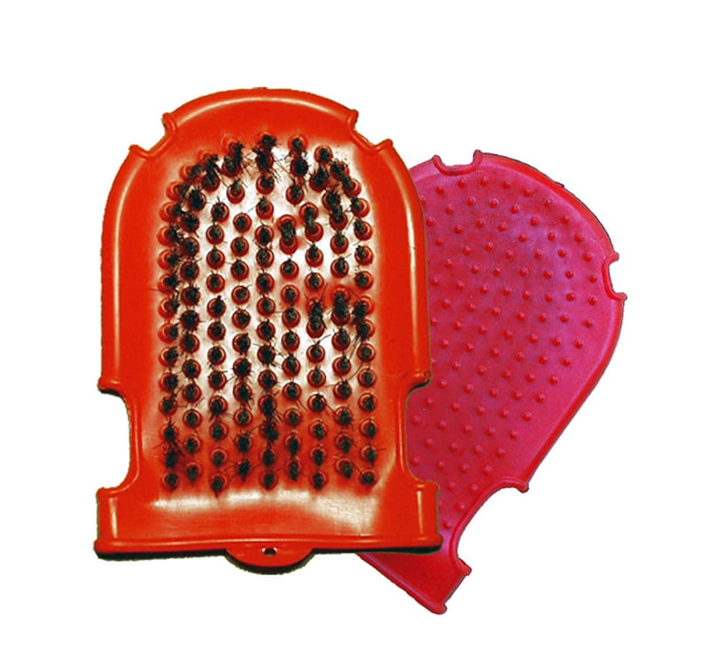 Guanto in gomma doppio ad uso spazzola e striglia disponibile in misura unica.