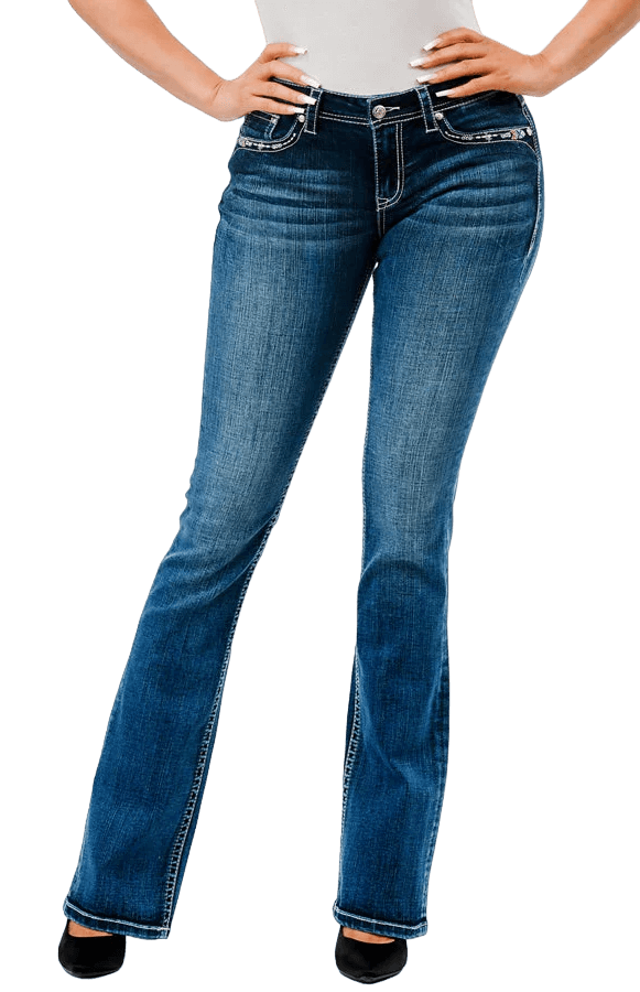 Jeans donna a vita media dettagliato con un disegno ricamato in pizzo sul collo sulle tasche posteriori, abbellimenti aggiunti sulle tasche anteriori, levigatura naturale a mano e baffature.