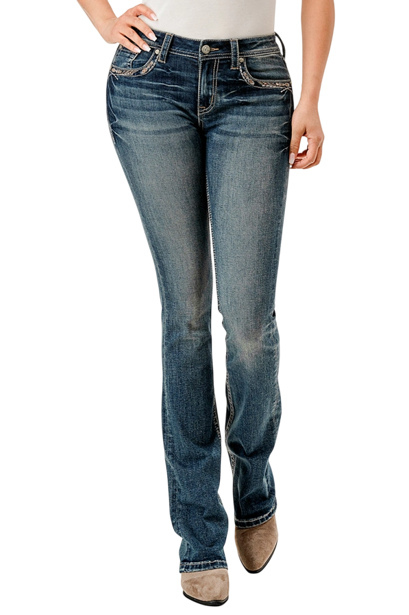 Jeans donna in denim elasticizzato leggero impreziosito da un motivo western decorato e ricamato sulle tasche posteriori e da ulteriori decorazioni sulle tasche anteriori, oltre auna levigatura naturale a mano e a una finitura baffata.