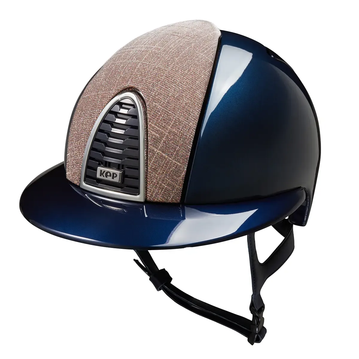 Kep Italia Cromo 2.0 blu lucido con visiera da polo blu lucida e fronte in tessuto speciale rosa galassia con cinturini in pelle blu. Imbottitura interna inclusa nel prezzo, da indicare la taglia nelle note d'ordine.