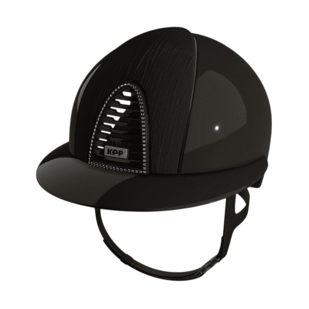 Kep Italia Cromo 2.0 marrone lucido con visiera da polo, fronte in tessuto speciale Vesna e cornice impreziosita da cristalli Swarovski. Imbottitura interna inclusa nel prezzo, da indicare la taglia nelle note d'ordine