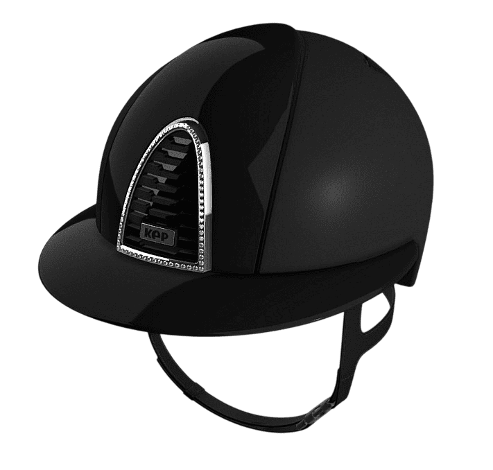 Kep Italia Cromo 2.0 nero opaco con fronte, retro e visiera da polo lucida con cornice a specchio cromo e cristalli Swarovski bianchi. Imbottitura interna inclusa nel prezzo, da indicare la taglia nelle note d'ordine.