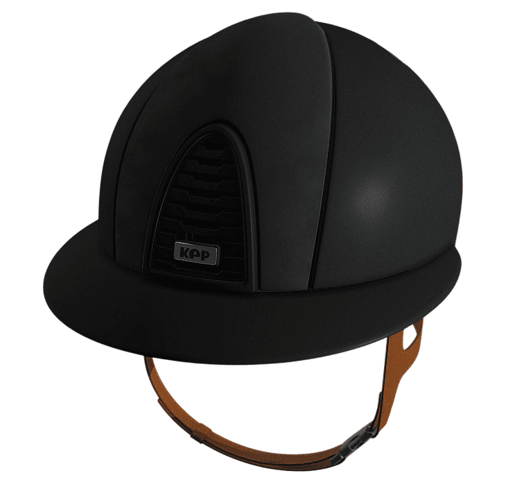 Kep Italia Cromo 2.0 nero opaco con inserto frontale e posteriore in velluto nero e cinturino in pelle beige. Imbottitura interna inclusa nel prezzo, da indicare la taglia nelle note d'ordine.