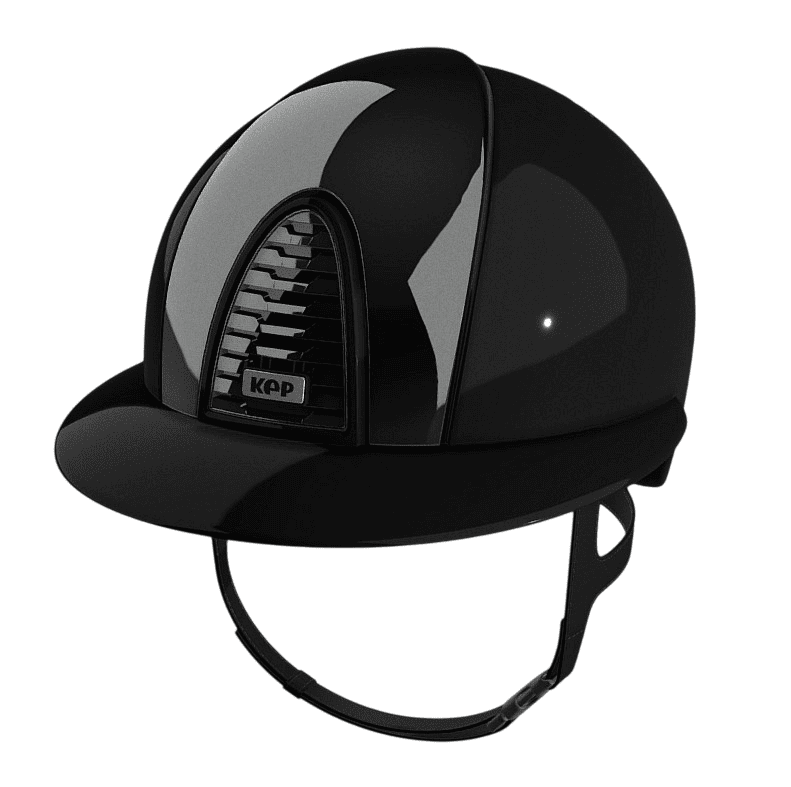 Kep Italia Cromo 2.0 nero lucido con visiera polo, fronte e retro a specchio nero e cinturino in pelle nero. Imbottitura interna inclusa nel prezzo, da indicare la taglia nelle note d'ordine.