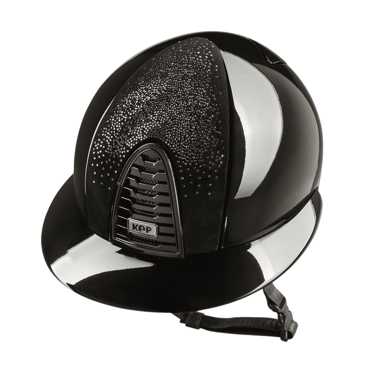 Kep Italia Cromo 2.0 nero lucido con visiera polo e fronte in camoscio nero sfumato con cristalli Silver. Imbottitura interna inclusa nel prezzo, da indicare la taglia nelle note d'ordine.