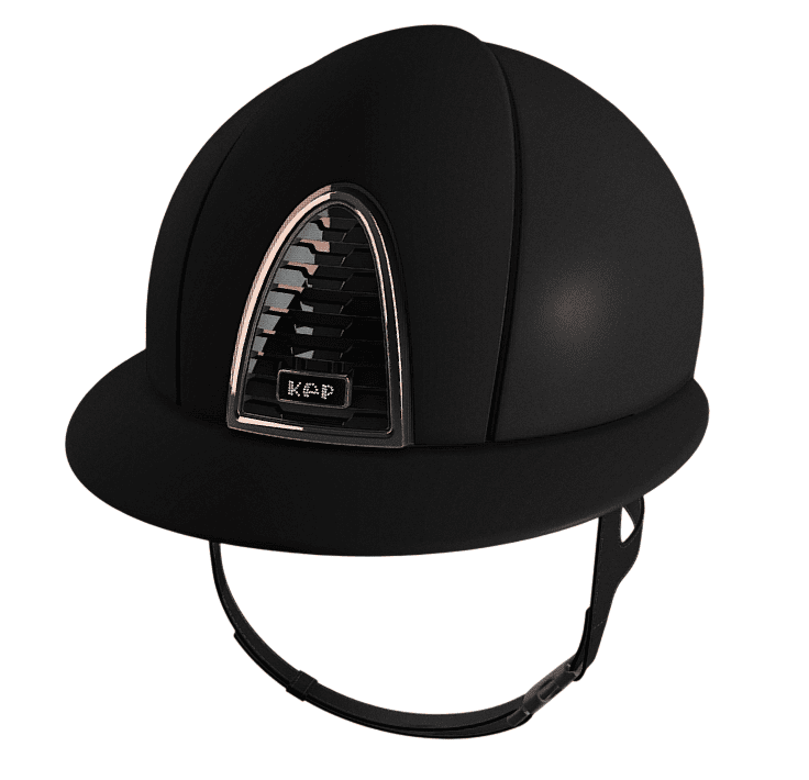 Kep Italia Cromo 2.0 tutto nero opaco con visiera da polo, cornice e sottogriglia a specchio oro rosa e logo Kep con zirconi. Imbottitura interna inclusa nel prezzo, da indicare la taglia nelle note d'ordine.