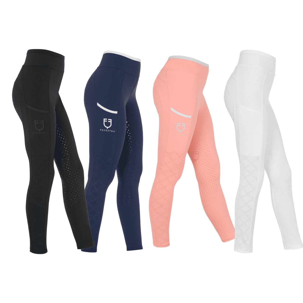 Leggings per equitazione estivi da bambina in tessuto tecnico bielastico e traspirante con ampia tasca laterale impreziosita con applicazioni stampate.
