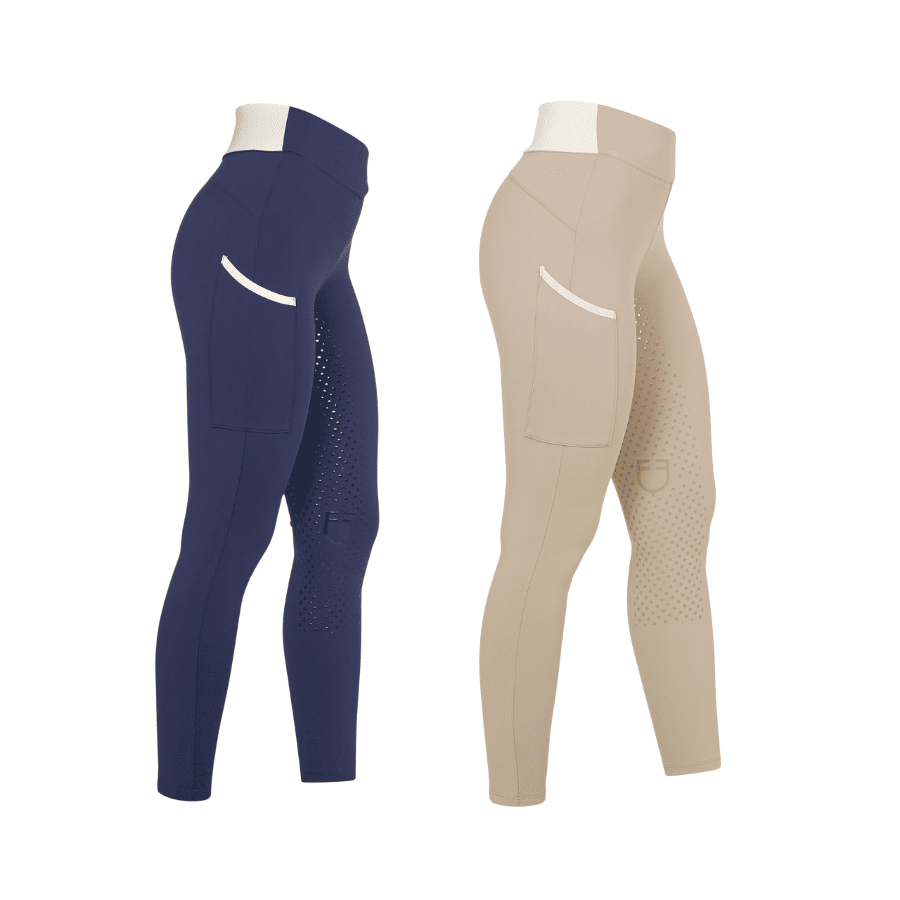 Leggings estivi Equestro slim fit in tessuto tecnico bielastico altamente traspirante con girovita intrecciato e dettagli bicolore. Disponibili nel modello full grip nel colore blu e nel colore beige.