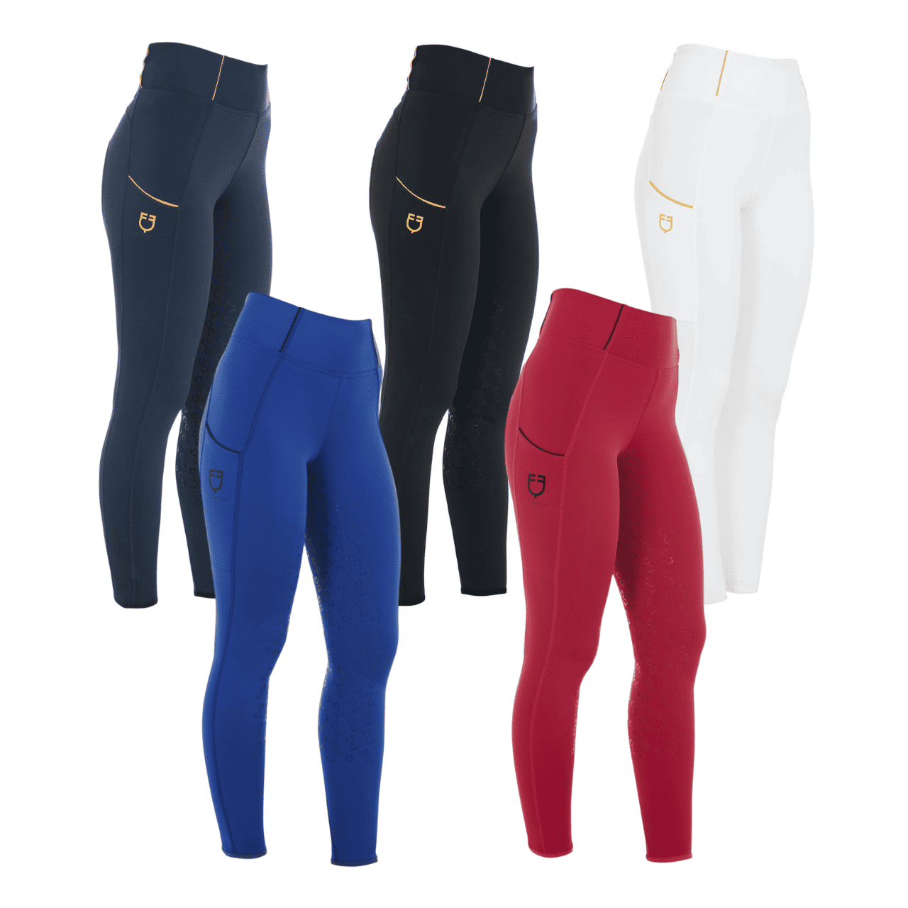 I leggings presentano una comoda tasca laterale, impreziosita da stampe raffiguranti il ​​logo Equestro. All'altezza del ginocchio, è presente un grip in silicone che prosegue sul retro migliorando la stabilità in sella e la posizione del cavaliere.