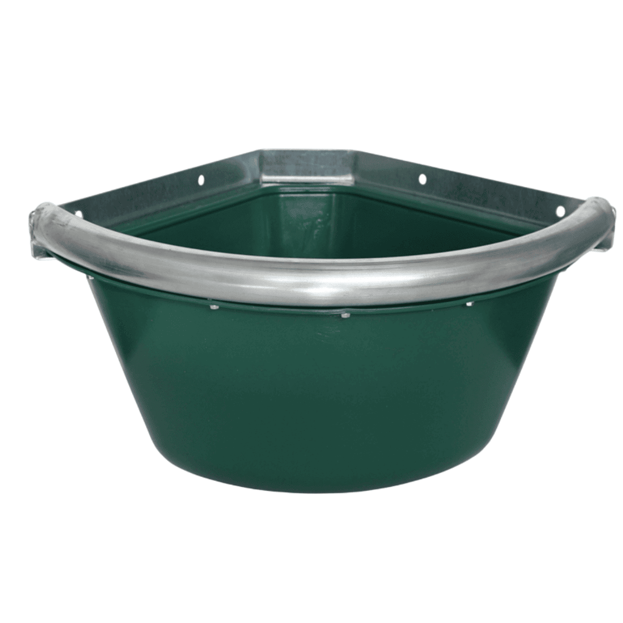 Mangiatoia angolare con bordo in metallo zincato e tappo per lavaggio.