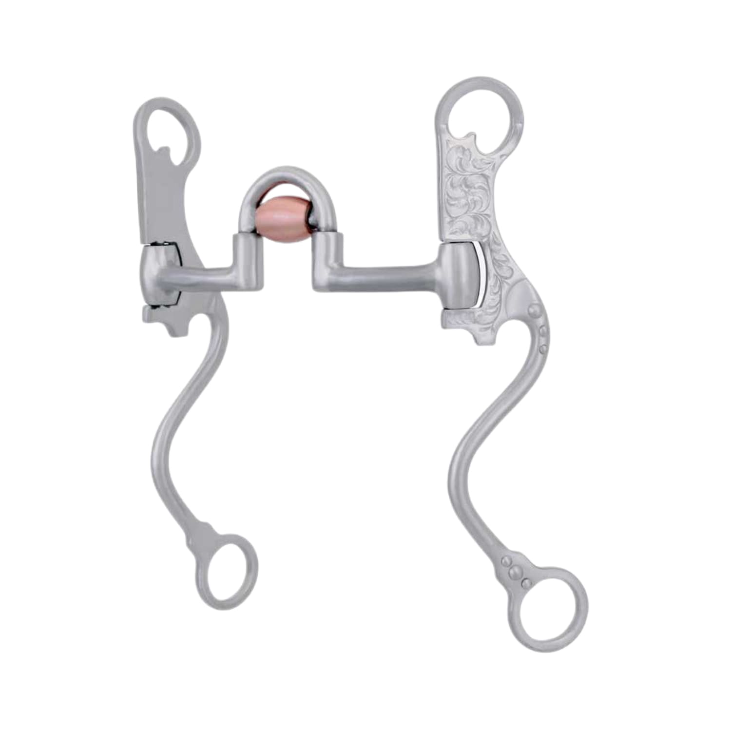 Morso correttivo realizzato in acciaio inox e rullo in rame satinato ed aste curve decorate.