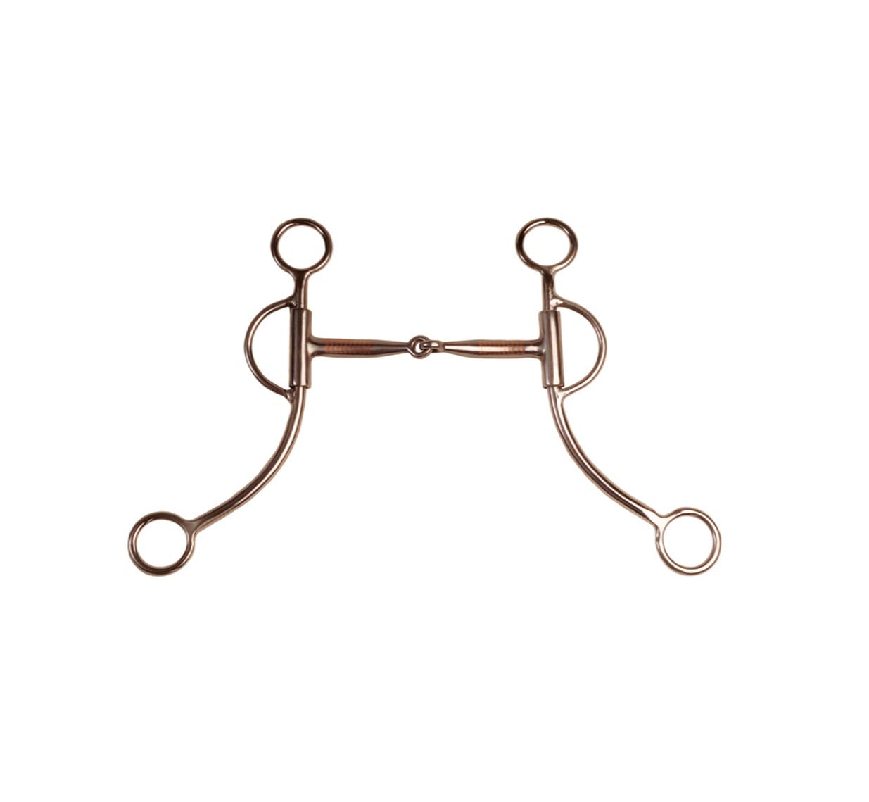 Morso western in acciaio inox snodato, imboccatura con inserti in rame, aste lunghe curve da 15 cm.
