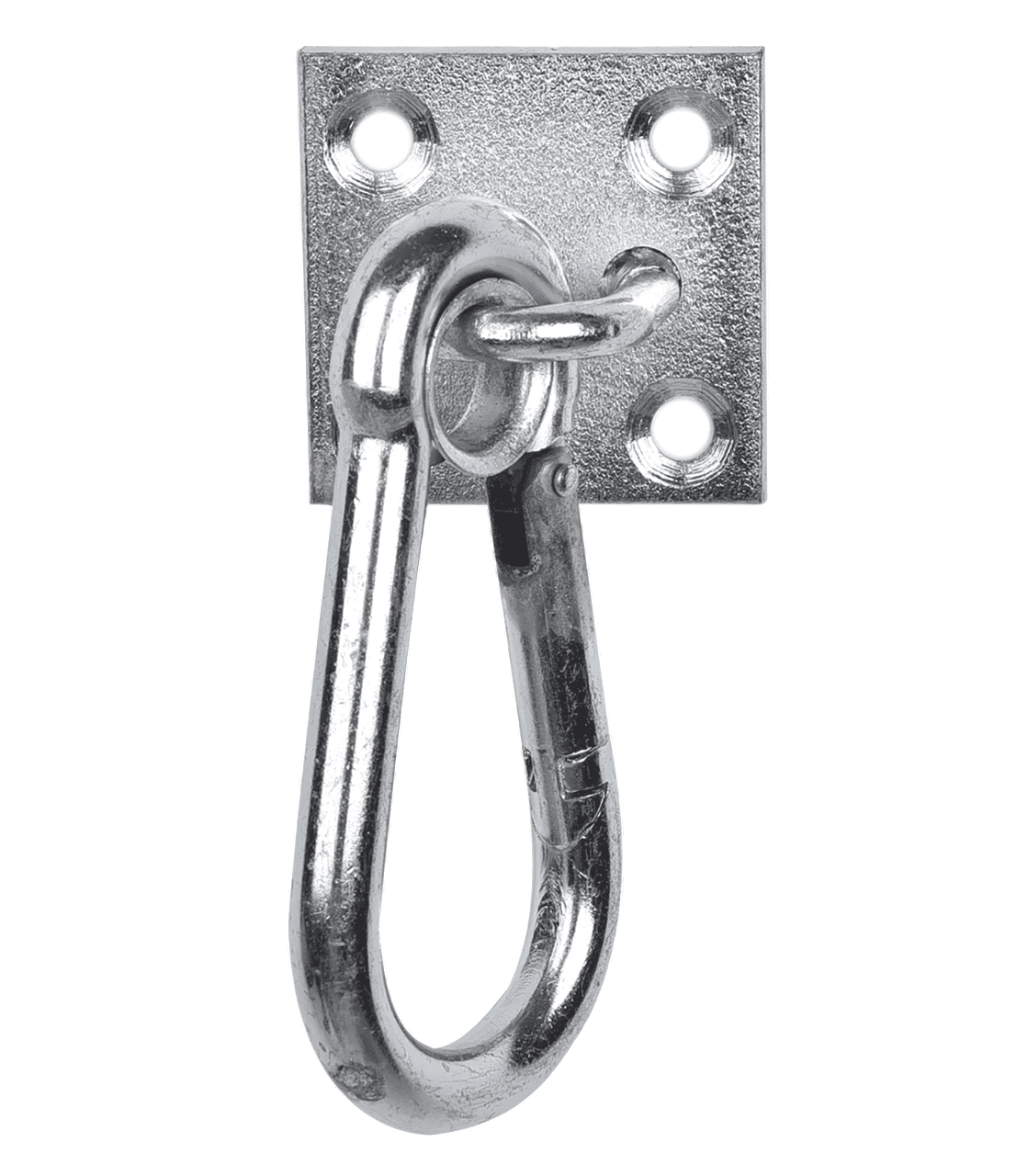 Moschettone a carabina con piastra in metallo zincato dotata di 4 fori per montaggio a parete.