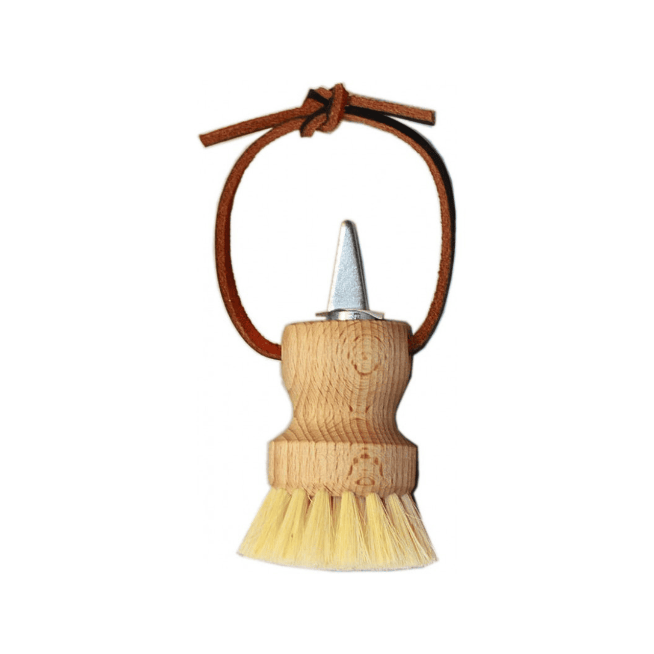 Nettapiedi per zoccoli fissato su manico rotondo con spazzola per la pulizia, realizzato in legno di faggio con setole mexfibre e cinturino in pelle per appenderlo.