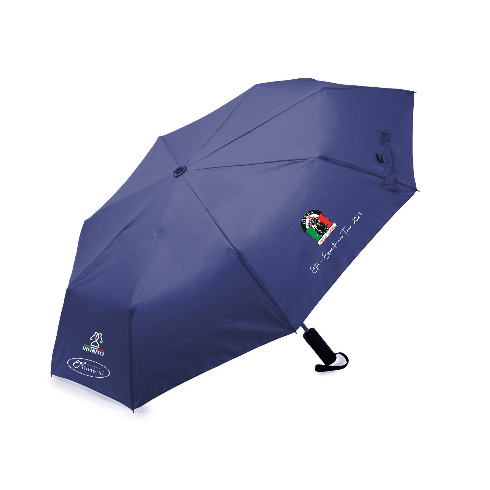 Ombrellino comodo e pratico per ripararsi dalla pioggia. Loghi 'Infinito', 'Tombini' e 'Etrea Equestrian Tour 2024' stampati frontalmente.