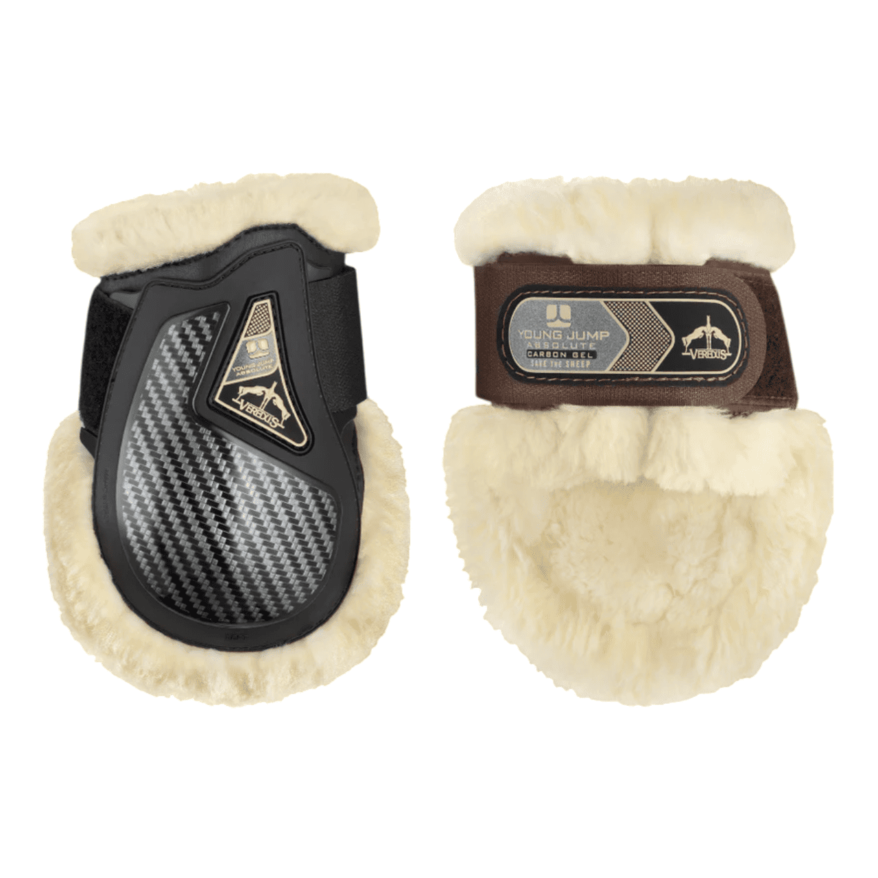 Paranocche posteriori Veredus Carbon Gel Absolute con velcro, adatte per i giovani cavalli in quanto conforme alle regole FEI. Questo modello di paranocche garantiscono una protezione assoluta grazie al materiale in carbonio e gel e imbottitura in Techno Sheepskin.