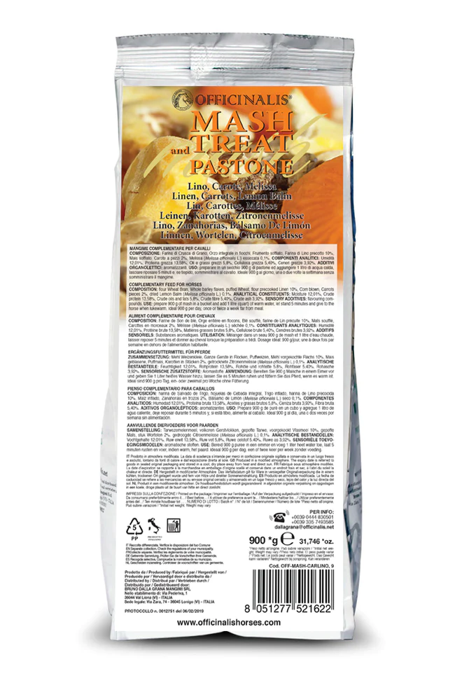 La ricca composizione di Mash&Treat include cereali soffiati precotti, crusca di grano tenero e semi di lino precotti (10%), creando una base nutriente completa per il sistema digestivo equino. L'aggiunta di carote a pezzi (2%) apporta preziosi antiossidanti naturali, mentre la melissa officinalis (0,1%) contribuisce con le sue proprietà calmanti e digestive riconosciute dalla tradizione erboristica.
