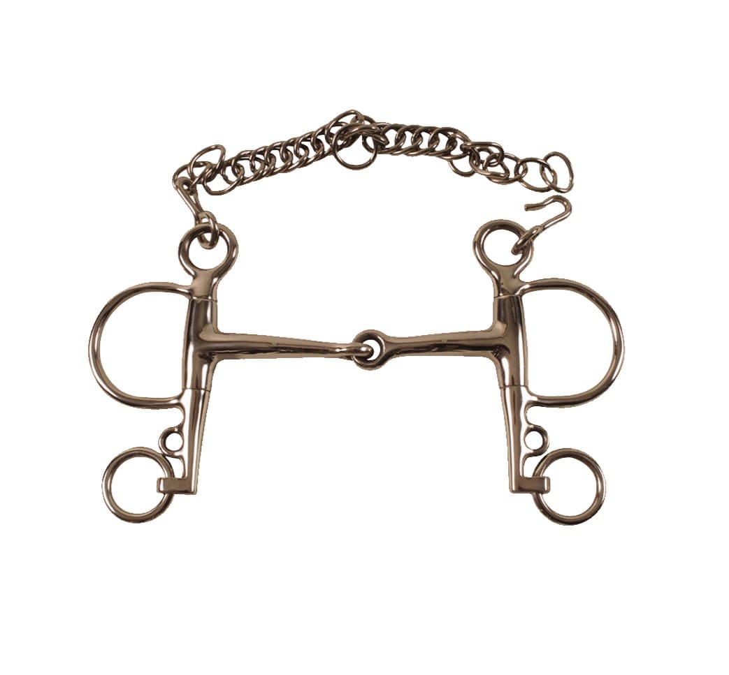 Pelham snodato ad aste corte (5 cm) con imboccatura piena da 18 mm in acciaio inox. Competo di barbozzale.
