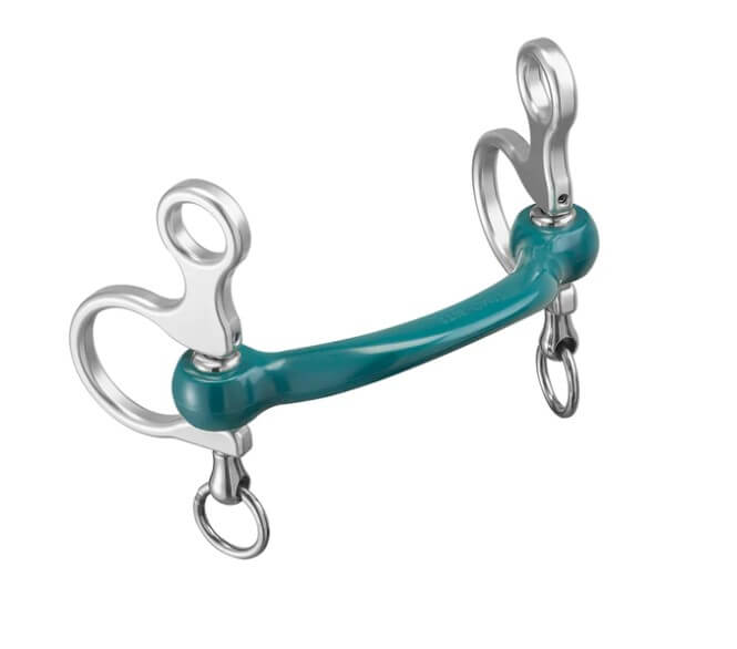Pelham Makebe con cannone curvo flessibile a leva corta realizzato in materiale termoplastico con bocchino a forma anatomica con ampie rondelle laterali che impediscono il pizzicamento del morso sulle commissure labiali e impediscono l'ingestione di aria. I supporti laterali sono unici sul mercato: sono realizzati in alluminio cnc insieme al miglior acciaio svedese.