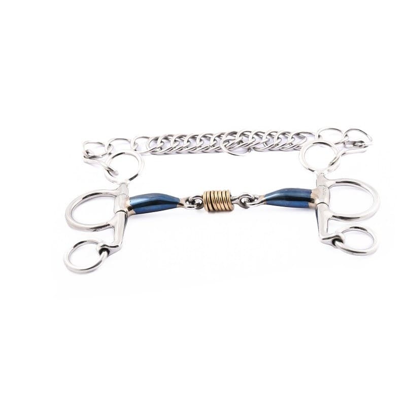 Pelham in acciaio dolce blu con cannone a doppio snodo che rende questo morso più confortevole nella bocca del cavallo, liberando la zona di disagio sul palato. Inoltre, gli anelli situati sullo snodo centrale favoriscono il rilassamento durante il lavoro.