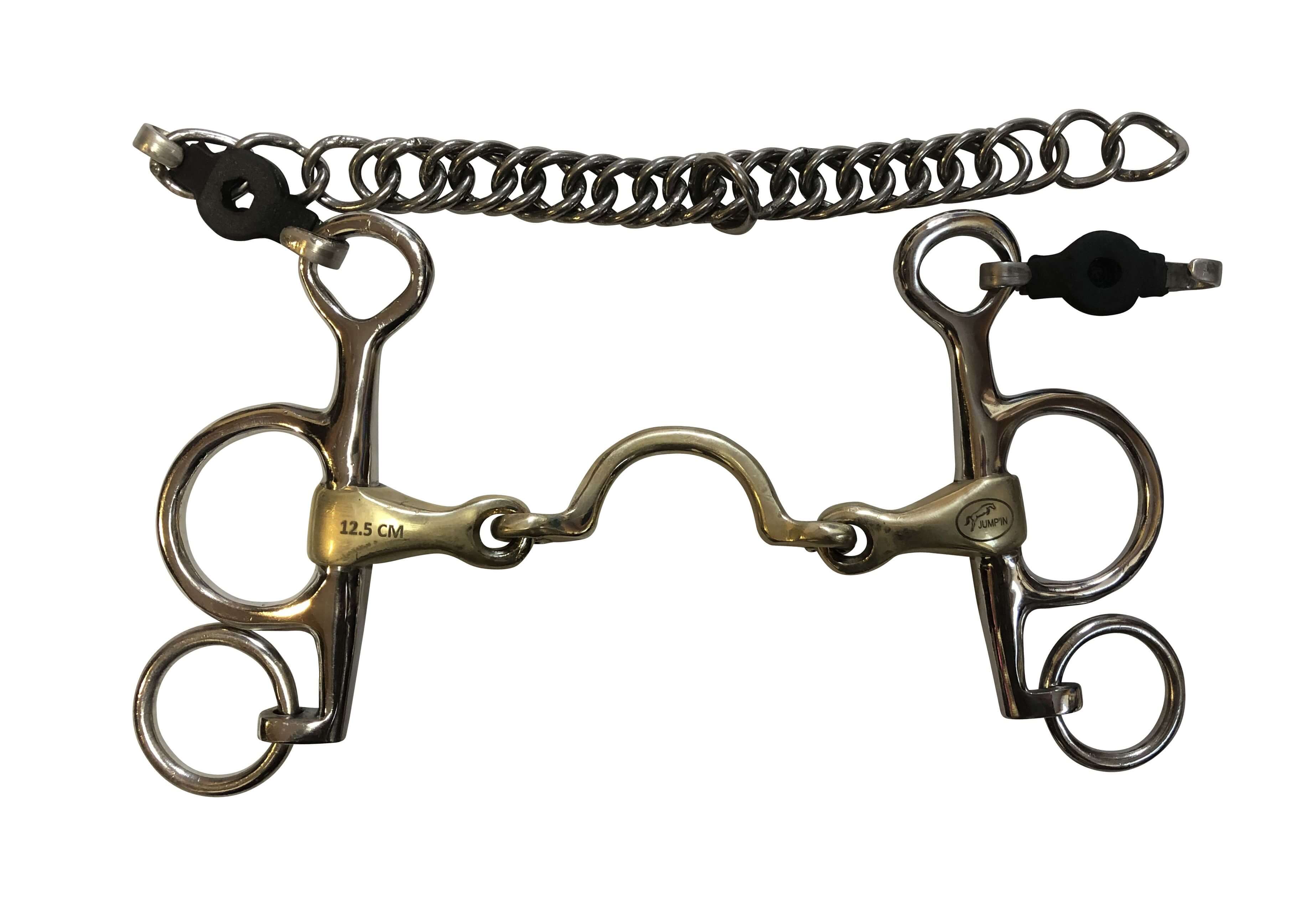 Pelham a doppio snodo in ottone con passaggio lingua. Lunghezza aste: 4,5 cm | Spessore cannone: 16 mm.
