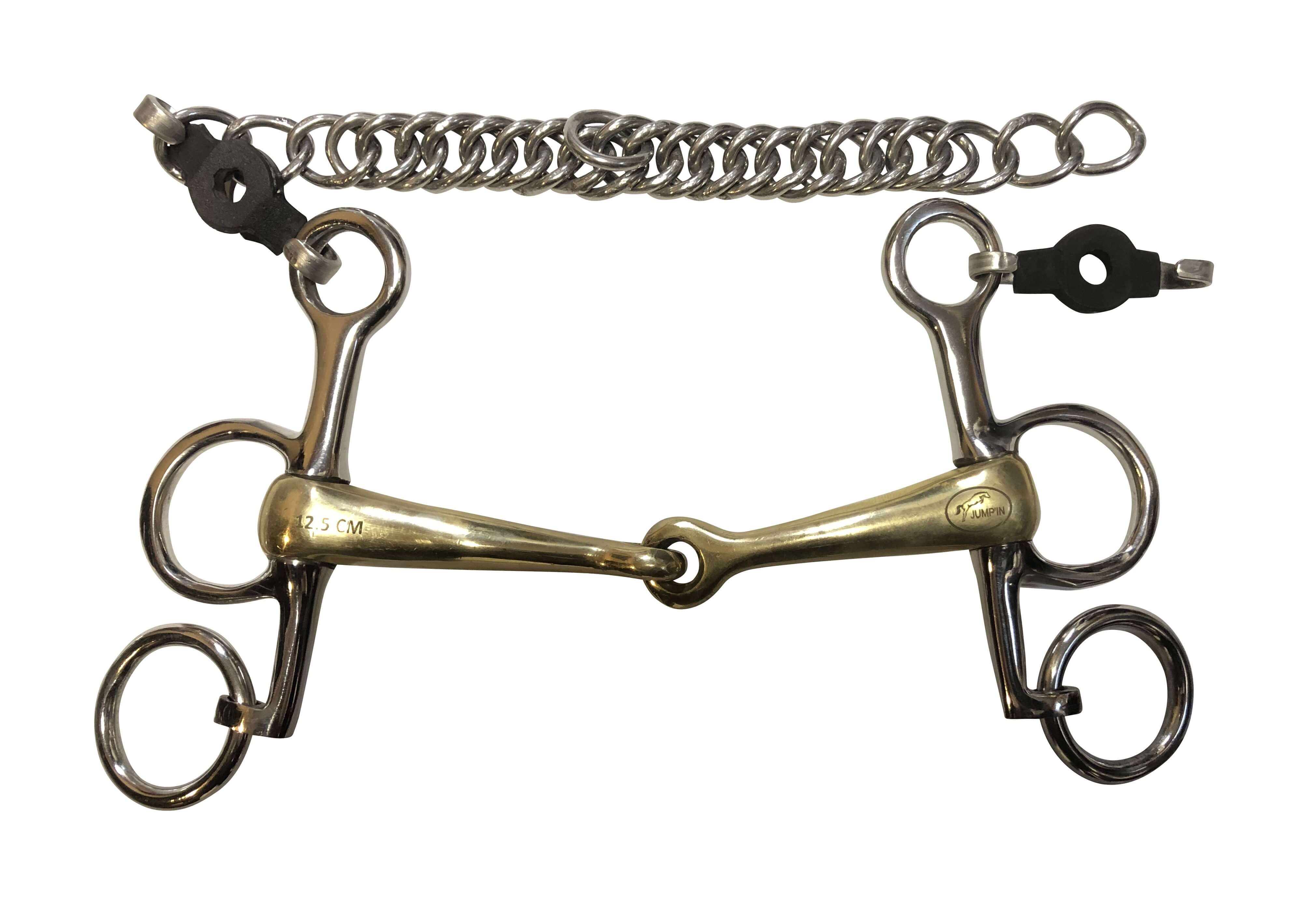 Pelham in ottone con chiamate corte in acciaio inox. Spessore cannone: 16 mm.