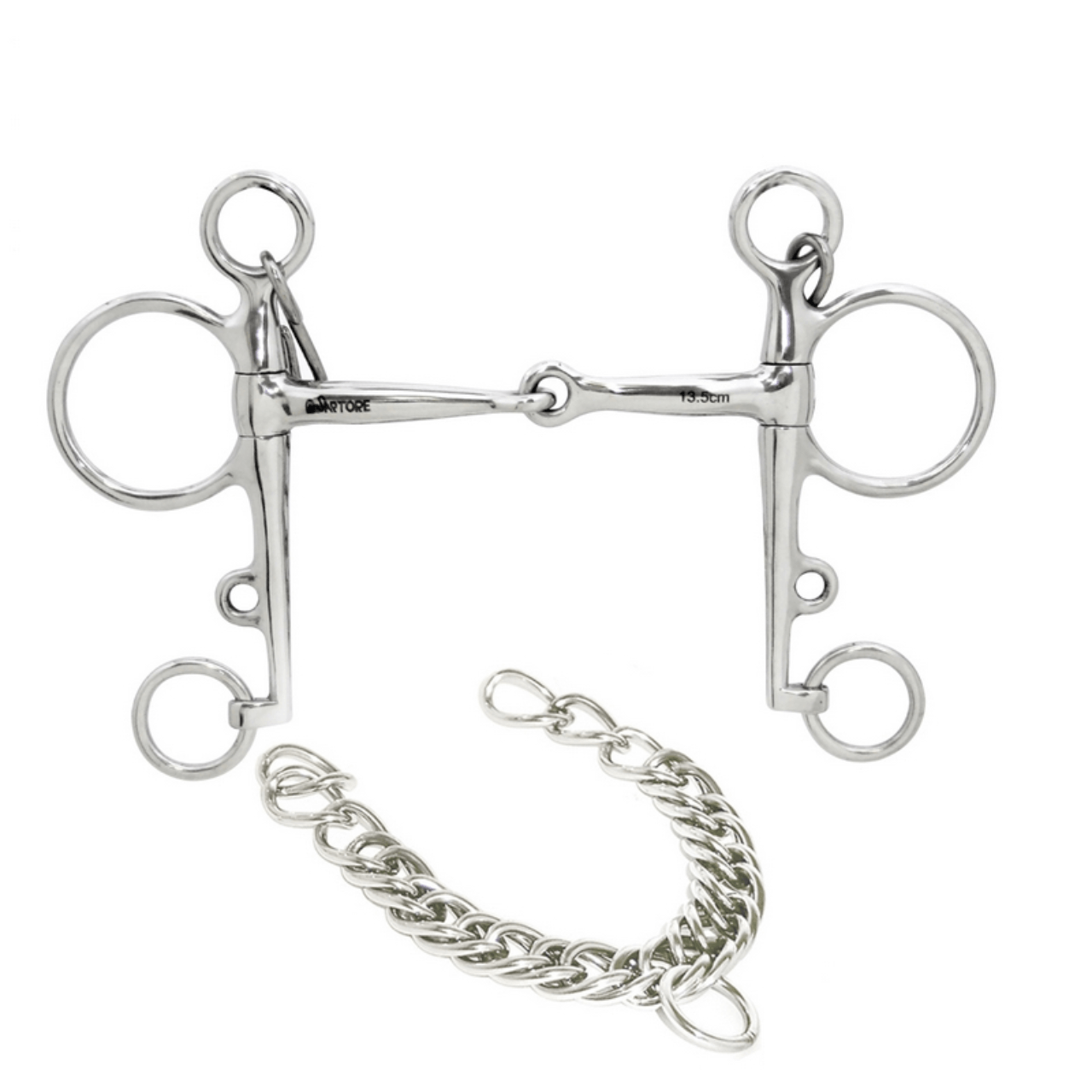Pelham snodato in acciaio inox pieno con chiamata di 140 mm e cannone spesso 13 mm. Dotato di barbozzale.