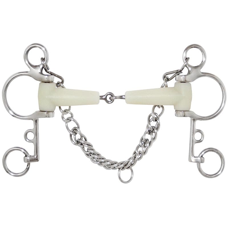 Pelham Happy Mouth spezzato in due aromatizzato alla mela con chiamate e barbozzale in acciaio inox. Spessore 20 mm.