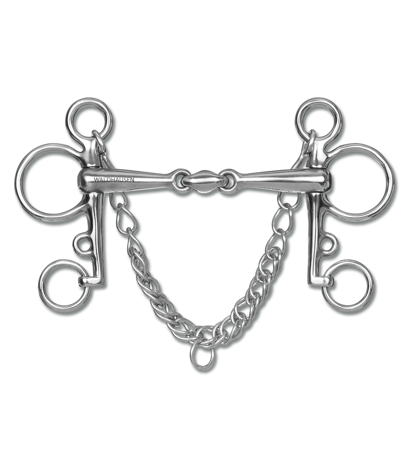 Pelham spezzato in tre con oliva in acciaio inox, fornito di barbozzale.