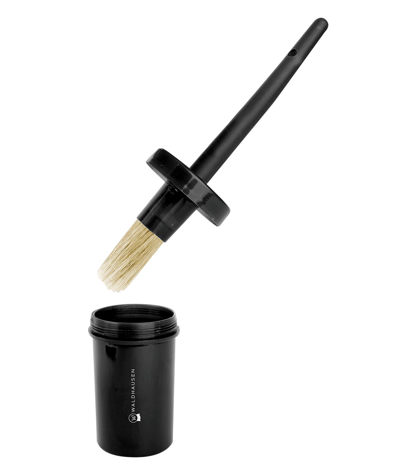 Pennello in morbide setole di maiale con portapennello per una maggiore pulizia e praticità d'uso.