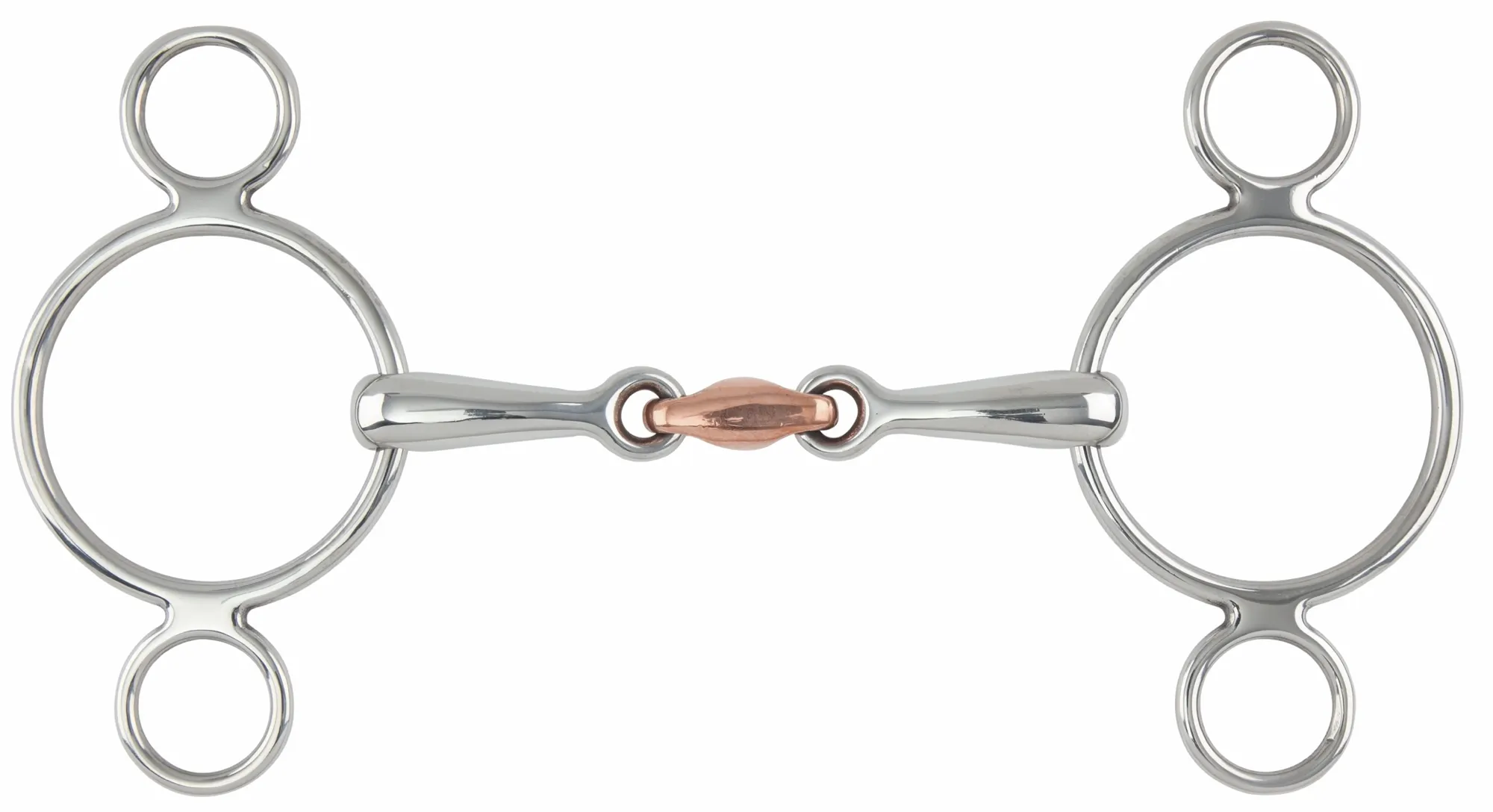 Questa imboccatura consente di posizionare la redine sull'anello principale o sull'anello inferiore più piccolo per una maggiore leva, mentre la losanga di rame incoraggia il cavallo a salivare.