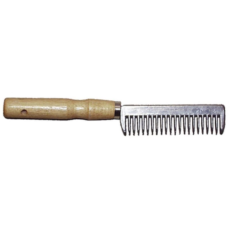 Pettine piccolo in alluminio con manico in legno.