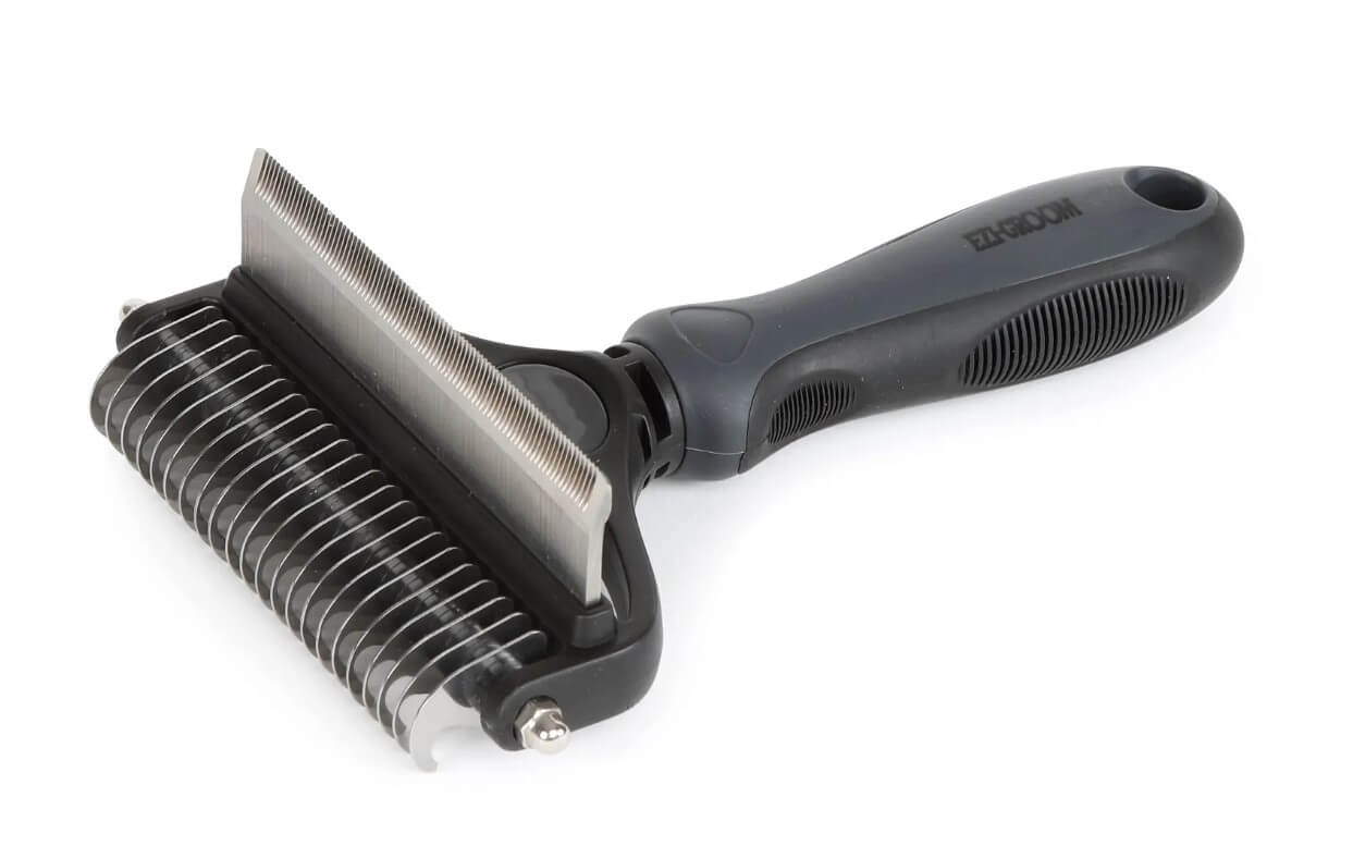 Semplifica il lavoro di toelettatura con questo versatile strumento di riordino che combina un pettine anti-spargimento e rastrello.