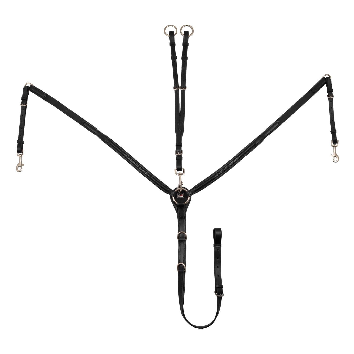 Pettorale in pelle a tre punti di attacco e martingala removibile. Completamente regolabile per garantire una perfetta adattabilità a qualsiasi tipo di cavallo.