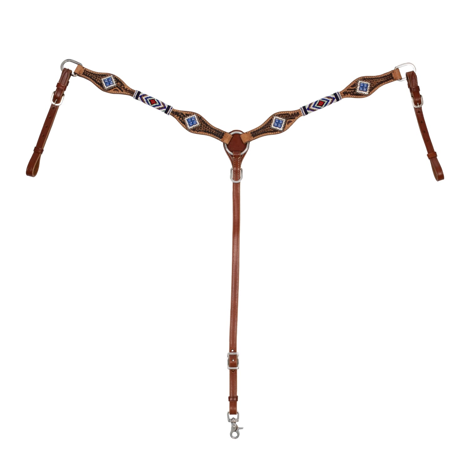 Pettorale western con decorazioni a rombi impreziositi da pietre blu realizzato in cuoio morbido, ingrassato e di alta qualità, perfetto per tutti i tipi di lavoro, sia per essere utilizzati tutti i giorni negli allenamenti che in gara.