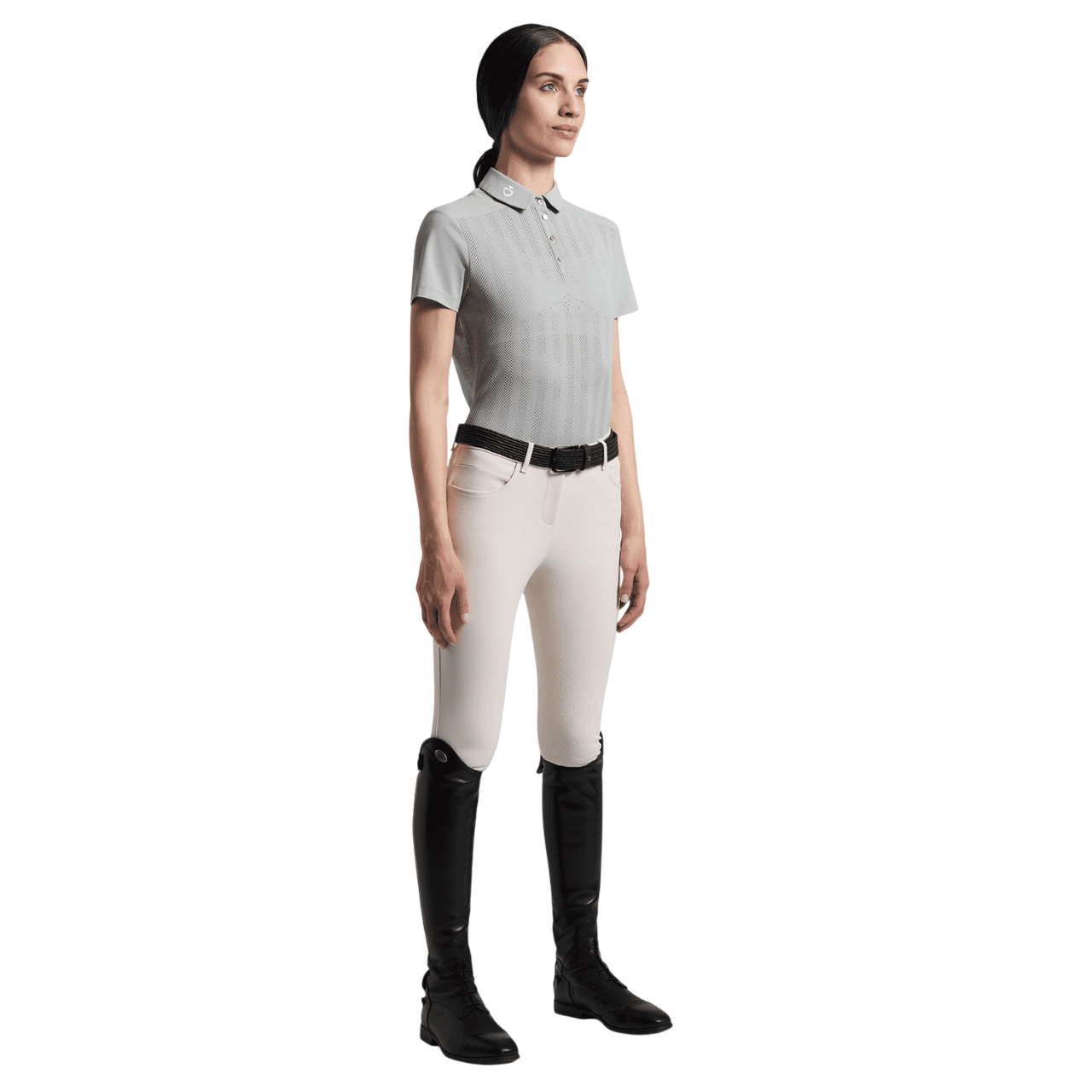 Polo da training cavalleria Toscana a mezza manica realizzato in un innovativo jersey jacquard che presenta una raffinata texture a righe verticali, garantendo un'estetica curata e un'ottima traspirabilità.