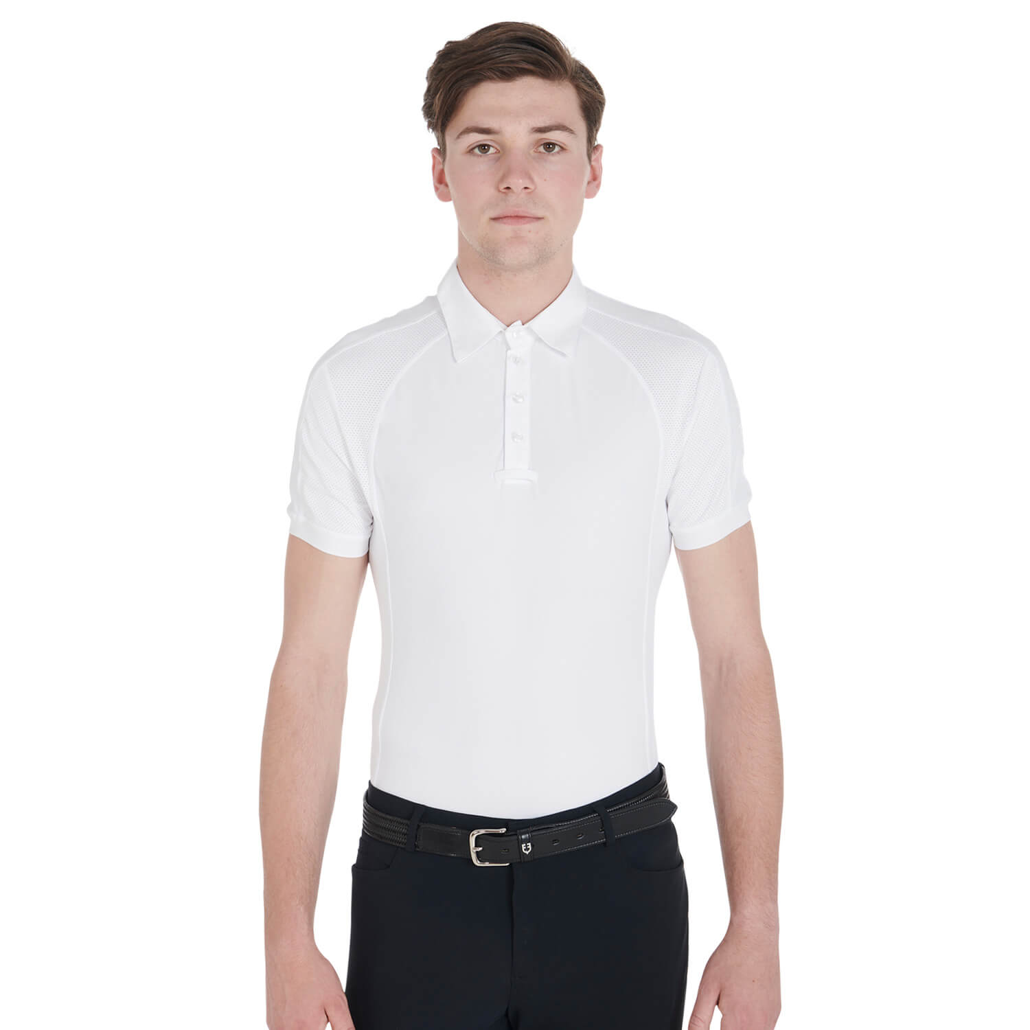 Polo uomo slim fit a mezza manica con elastico in tessuto tecnico traspirante super performante grazie alla presenza del tessuto traforato posto sui fianchi. Ciò permette di contrastare il calore e di mantenere quindi una normale temperatura corporea.