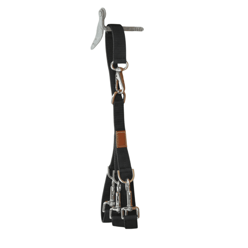 Porta briglie fatto di cinghie in nylon e moschettoni (tre), grazie al quale potrai facilmente sospendere le tue briglie senza sforzo e ovunque tu voglia.