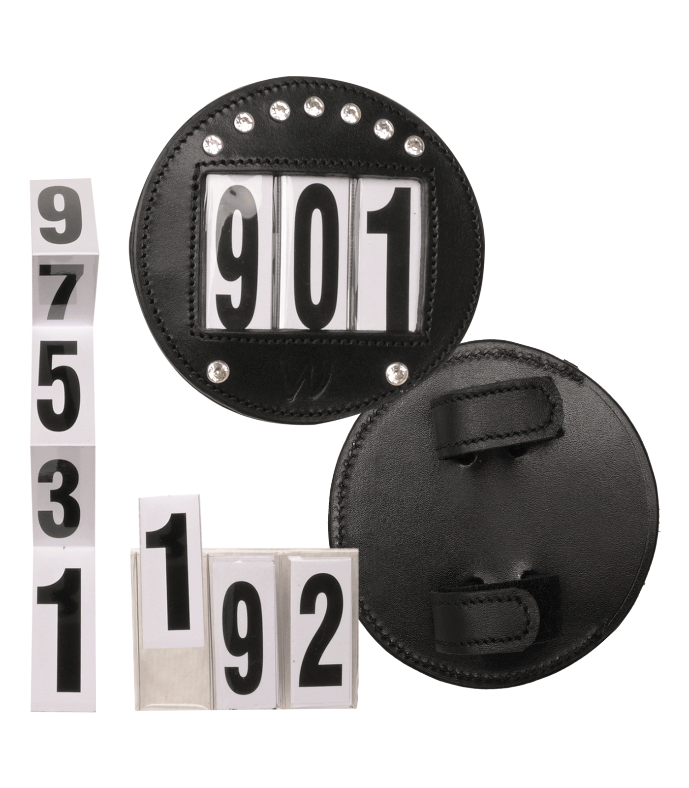 Portanumero in morbido cuoio con raffinati strass. Sostituzione rapida del numero di partenza da 1 a 999.