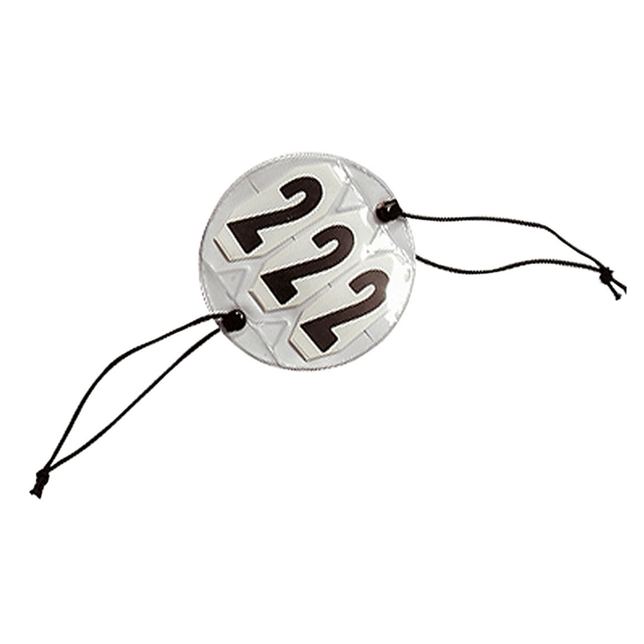 Porta numero rotondo per briglia in plastica morbida, completo di fascette elastiche per il fissaggio.