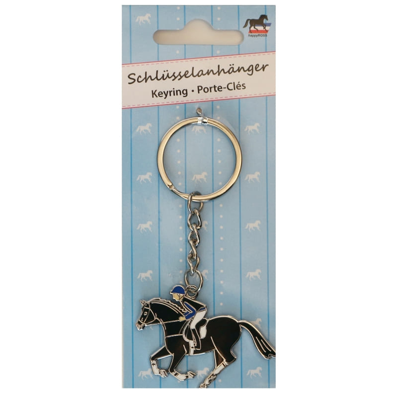 Portachiavi raffigurante un cavallo e un fantino durante una gara di corsa.
