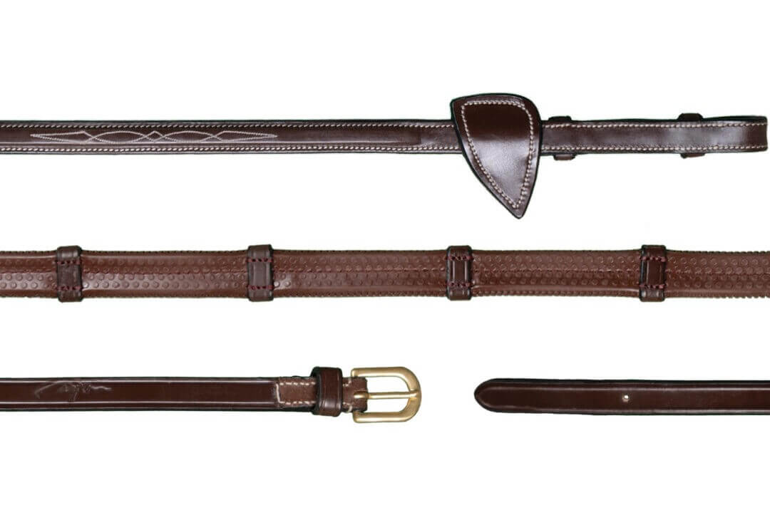 Redini in gomma con 7 passanti (o tacche) in pelle con stopper Dyon disponibili con fibbie ottone nella variante di cuoio marrone e nero.