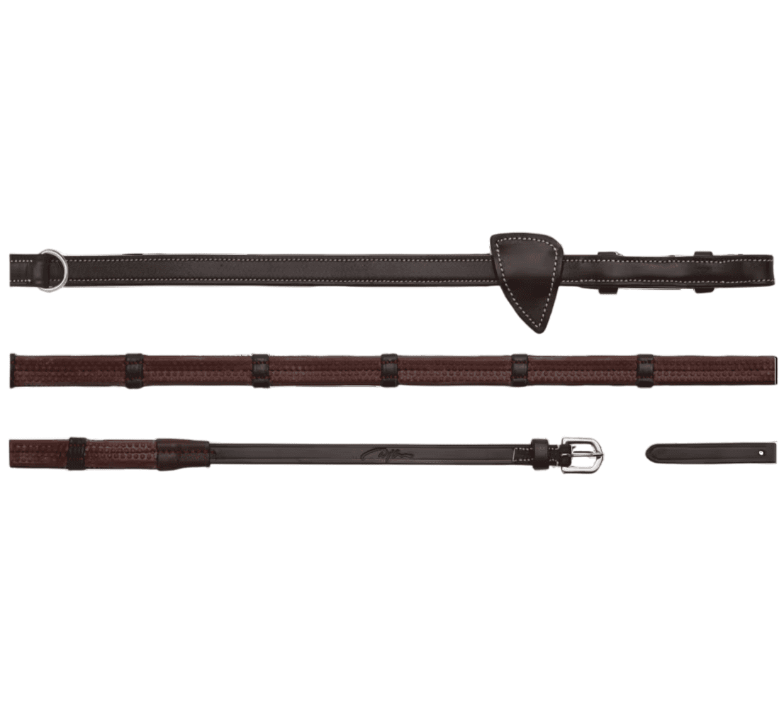 Redini in gomma Dyon modello Howlett realizzate in cuoio con 7 tacche ed un singolo anello Dee fissato all'inizio della redine da utilizzare in combinazione con la martingala con moschettoni.