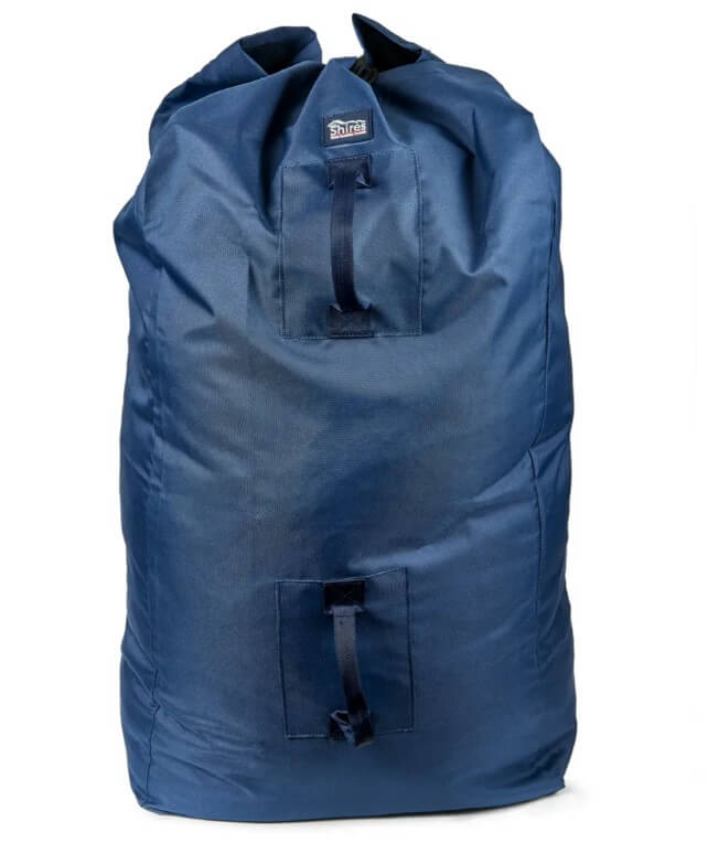 Una borsa a forma di balla realizzata in nylon resistente con due manici per il trasporto.