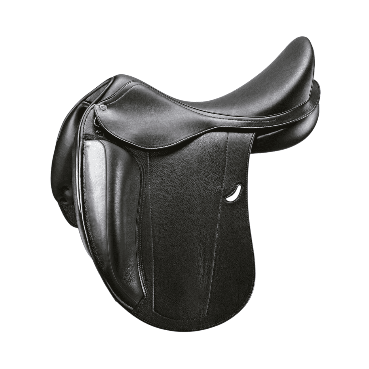Sella da dressage monoquartiere con pellame doppiato disponibile nella variante di colore nero e marrone.